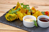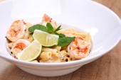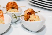 ryż z krewetkami i ananasem w białej misce, widok z bliska