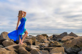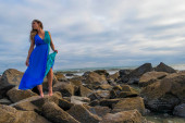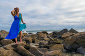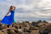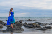 Piękna brunetka latynoska modelka pozuje na zewnątrz na plaży o zachodzie słońca