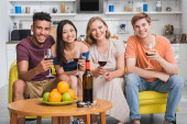 podekscytowany Afryki amerykański mężczyzna pokazując kciuk w górę podczas młoda kobieta gra na gitarze dla wielokulturowych przyjaciół