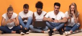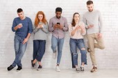 kolaż wieloetnicznych przyjaciół czatujących na telefonach komórkowych podczas imprezy, nagłówek strony
