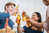 wielokulturowi przyjaciele rozmawiają trzymając butelki piwa w pobliżu miski z popcornem