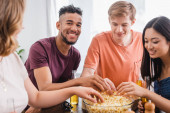podekscytowany amerykański mężczyzna trzyma miskę popcornu w pobliżu wielokulturowych przyjaciół