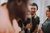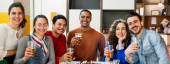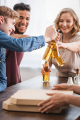 panoramiczna koncepcja wieloetnicznych przyjaciół z butelkami piwa rozmawiającymi podczas imprezy