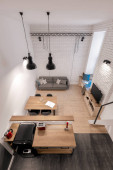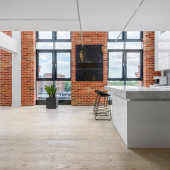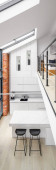Stylowy dwupiętrowy apartament na poddaszu z odsłoniętą cegłą na ścianach i dużymi oknami