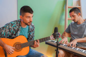 Zdjęcie "Przystojny mężczyzna pracujący w domu z laptopem, robiący koncert online z gitarą od kamery do komputera. Pracuję w domu. Muzyk. Koronawirus. " może być wykorzystywane do celów osobistych i komercyjnych zgodnie z warunkami zakupionej licencji Royalty-free. Obraz jest dostępny do pobrania w jakości wysokiej rozdzielczości do 5760x3840.