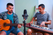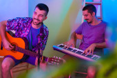 Przystojny mężczyzna pracujący w domu z laptopem, robiący koncert online z gitarą od kamery do komputera. Pracuję w domu. Muzyk. Koronawirus.