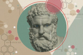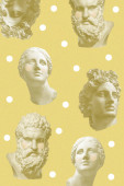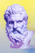 Kolaż artystyczny z zabytkową rzeźbą Heraklesa twarzy i liczb, kształty geometryczne. Nauka, badania, odkrycie, koncepcja technologii. Piękno, moda i zdrowie tematu. Kultura cynku. Pop stylu sztuki.