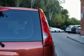 Tylne okno szarego samochodu zaparkowanego na ulicy w letni słoneczny dzień, widok z tyłu. Makieta naklejki lub naklejek
