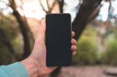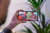 Koncepcja koronawirusa. Wsteczny widok mężczyzny oglądającego koncert na żywo podczas pobytu w domu. Zbliżenie mężczyzny korzystającego z muzycznego koncertu przez telefon komórkowy. Zostań w domu. Kwarantanna. Izolacja.
