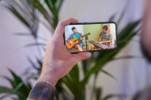 Koncepcja koronawirusa. Wsteczny widok mężczyzny oglądającego koncert na żywo podczas pobytu w domu. Zbliżenie mężczyzny korzystającego z muzycznego koncertu przez telefon komórkowy. Zostań w domu. Kwarantanna. Izolacja.