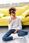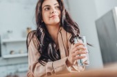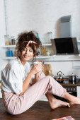 horyzontalny obraz kręconej kobiety pijącej świeży sok pomarańczowy