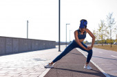młoda kobieta rozciągająca nogi na zewnątrz, ciesząca się codzienną rutyną rozgrzewającą się przed bieganiem