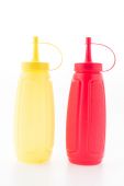 Butelka keczupu i sosu musztardowego izolowana na białym tle. Przestrzeń kopiowania