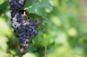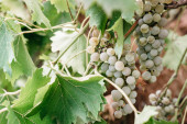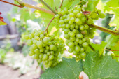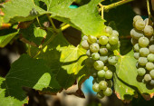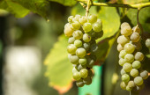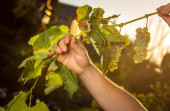 Zbiory wina. Grona białych winogron w promieniach zachodzącego słońca. Jesień to czas zbiorów winogron i produkcji wina.