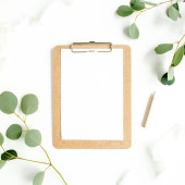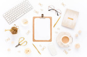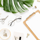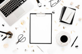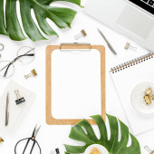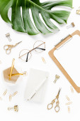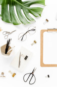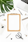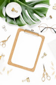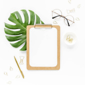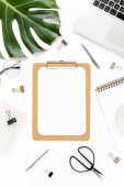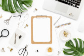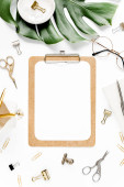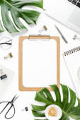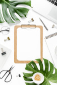 Strona główna biuro workspace makieta z tropikalnych liści Monstera, schowek, i akcesoria na białym tle. Płaskie ułożenie, widok z góry