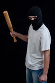 człowiek w czarne ubrania sobie klasyczne maski gazowe na ciemny tył