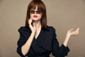 modna kobieta w czerwonej koszuli na lekkim tle zabawy emocje jasny makijaż okulary atrakcyjny wygląd