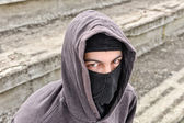 człowiek w czarne ubrania sobie klasyczne maski gazowe na ciemny tył