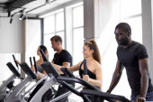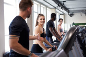 międzynarodowe szkolenie w siłowni, ludzie rozmawiają podczas treningu
