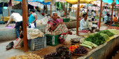 DISTRICT KATNI, INDIA - PAŹDZIERNIK 13, 2019: Hindusi tłumnie kupują warzywa na rynku rolnym.