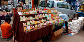 DISTRICT KATNI, INDIA - PAŹDZIERNIK 19, 2019: Religijna oferta boga wystawiona na sprzedaż na bazarze podczas festiwalu hindu diwali.