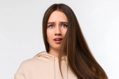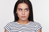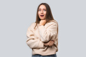 Zdjęcie "Zdjęcie zamyślonej kobiety kąsa dolną wargę, wygląda z sennym wyrazem twarzy na bok, w stylowej beżowej bluzie z kapturem, stoi pod białą ścianą" może być wykorzystywane do celów osobistych i komercyjnych zgodnie z warunkami zakupionej licencji Royalty-free. Obraz jest dostępny do pobrania w jakości wysokiej rozdzielczości do 5760x3840.