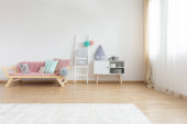 Zdjęcie "Nowoczesne wnętrze pokoju nastolatka z łóżkiem i fotelem" może być wykorzystywane do celów osobistych i komercyjnych zgodnie z warunkami zakupionej licencji Royalty-free. Obraz jest dostępny do pobrania w jakości wysokiej rozdzielczości do 5760x3840.