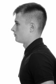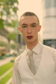 Portret młodego, przystojnego, androgenicznego biznesmena zwiedzającego miasto w czerni i bieli