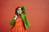 Czerwony i zielony. Piękny zrelaksowany młoda kobieta patrząc się marzycielski modny w stylowej kurtce sukienka i opaska. Trendy artystyczne. pokolenie Zoomerów. jasny nasycony wesoły mix kolorów