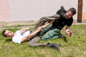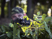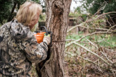 Facet zbiera grzyby. Mężczyzna trzyma nóż i szykuje się do przecięcia boleta..