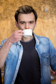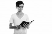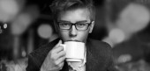 Portret młodego, przystojnego, androgenicznego biznesmena zwiedzającego miasto w czerni i bieli
