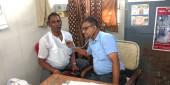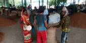 DISTRICT KATNI, INDIA - sierpień 06, 2019: Indyjscy rolnicy wiejscy otrzymujący płatności ze sprzedaży na rynku rolnym produkują żywność w rządowym korporacji godown.