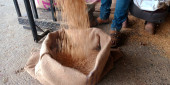 DISTRICT KATNI, INDIA - sierpień 06, 2019: Indyjski rolnik wiejski czyszczący ziarno pszenicy z worków w rolnictwie produkuje produkty w rządowej korporacji spożywczej godown.