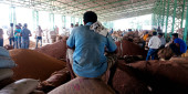 DISTRICT KATNI, INDIA - sierpień 06, 2019: Indyjscy rolnicy wiejscy pracujący w rolnictwie produkują produkty w rządowej korporacji spożywczej Godown.