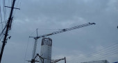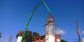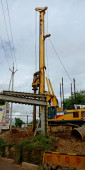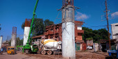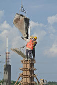 DISTRICT KATNI, INDIA - LIPIEC 16, 2019: Indyjski pracownik budownictwa drogowego wspinający się na słup cementowy do budowy wiaduktów na tle nieba.