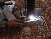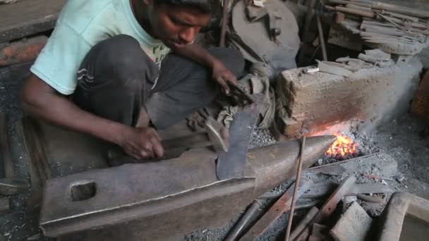 DISTRICT KATNI, INDIA - LIPIEC 29, 2019: Indiański kowal wykonujący prace spawalnicze w wiejskim warsztacie.