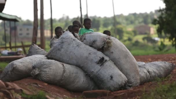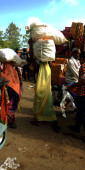 DISTRICT KATNI, INDIA - sierpień 07, 2019: Indyjski pracownik przewożący worek ciężarowy z ręcznego transportu drogowego na rynek.