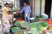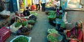DISTRICT KATNI, INDIA - 12 sierpnia 2019: azjatycki warzywniak sprzedający świeże produkty rolne na rynku.
