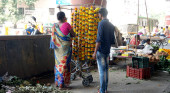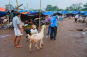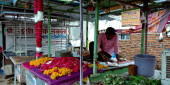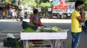 DISTRICT KATNI, INDIA - 12 sierpnia 2019: rikszarz azjatycki samodzielnie ładuje woreczki z warzywami na drogę.