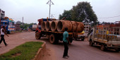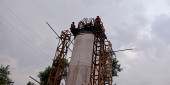 DISTRICT KATNI, INDIA - WRZESIEŃ 05, 2019: Indyjski pracownik przeprawiający się przez most podczas budowy dróg.