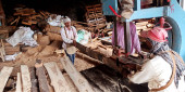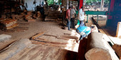 DISTRICT KATNI, INDIA - WRZESIEŃ 16, 2019: Azjatycki biedny drwal obsługujący pilarkę w tartaku.
