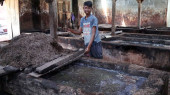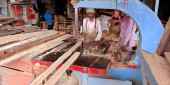 DISTRICT KATNI, INDIA - WRZESIEŃ 16, 2019: Azjatycki drewniany pracownik rąbiący kłody drewna z maszyny elektrycznej w fabryce tartaków.
