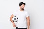 młody Irlandczyk trzyma piłkę nożną myślenie postawa i trzeźwy wyraz twarzy patrząc pewny siebie