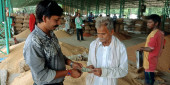 DISTRICT KATNI, INDIA - WRZESIEŃ 18, 2019: Indyjska wiejska siła robocza pracująca wspólnie na rynku upraw zboża surowego.