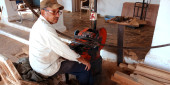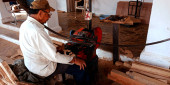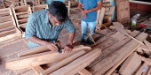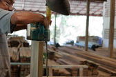 DISTRICT KATNI, INDIA - GRUDZIEŃ 09, 2019: Indiański pracownik samochodowy mierzący drewniany dziennik z kranu miernika do wykonania ramy nadwozia samochodu ciężarowego w garażu wewnętrznym.