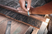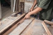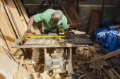 Zdjęcie "DISTRICT KATNI, INDIA - GRUDZIEŃ 09, 2019: Indiański pracownik samochodowy mierzący drewniany dziennik z kranu miernika do wykonania ramy nadwozia samochodu ciężarowego w garażu wewnętrznym." może być wykorzystywane do celów osobistych i komercyjnych zgodnie z warunkami zakupionej licencji Royalty-free. Obraz jest dostępny do pobrania w jakości wysokiej rozdzielczości do 5760x3840.