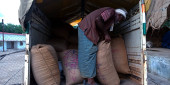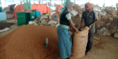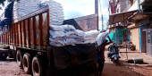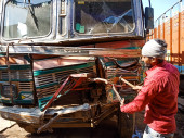 DISTRICT KATNI, INDIA - GRUDZIEŃ 09, 2019: Indiański mechanik otworzy oponę ciężarówki na drodze w warsztacie otwartym.