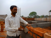 DISTRICT KATNI, INDIA - GRUDZIEŃ 13, 2019: Indiański pracownik wsi przytwierdzający cegły do budowy słupa podczas prac budowlanych na placu budowy.