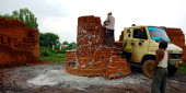 DISTRICT KATNI, INDIA - GRUDZIEŃ 21, 2019: Indyjski pracownik wsi rozładowuje cegły z załadowanego ciągnika na zewnątrz.