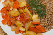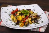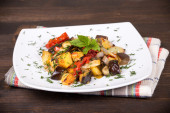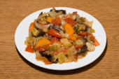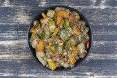 Duszone warzywa w czarnej misce na drewnianym stole, zbliżenie, widok z góry